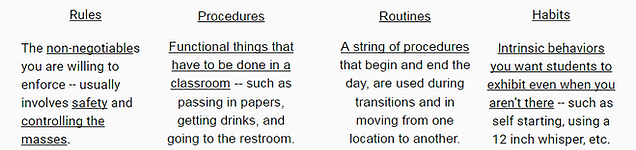 Establishing clear, consistent classroom routines and procedures from the outset of the school year will be a time-saver as well as creating a classroom climate of calm and focused productivity. Once procedures are explained and practiced consistently, they become habitual, creating an environment that is less stressful for everyone, removing many sources of potential conflict, and helping teachers and students alike focus on the work at hand.
